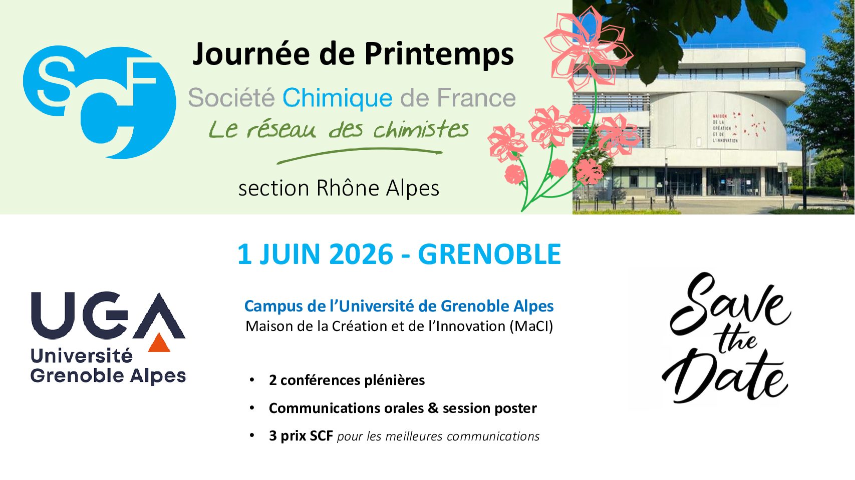 16 mars 2026 Save the date: Journée SCF-RA le 1 juin 2026 sur le campus de l’UGA à la MACI 24 septembre 2025 Le Réseau Jeune présente l’Apéro Chimie à Lyon et Grenoble en Septembre et Octobre 11 mars 2025 Register and submit your abstract now ! SCF-RA Spring day on June 3rd 2025 in Lyon 13 février 2025 Save the date: Journée SCF-RA le 3 juin 2025 à CPE Lyon – Campus de La Doua 14 janvier 2025 Nouveau bureau pour le RJ-SCF-RA (Réseau des Jeunes Chimistes de la section Rhône-Alpes) 3 décembre 2024 [05 décembre] Réunion de recrutement du bureau RJ-Rhône-Alpes / Recruitment meeting for Young Researchers-Rhône-Alpes network 24 septembre 2024 Annonce des prix de master 2024! félicitations aux lauréats! 24 septembre 2024 Election du nouveau bureau SCF-Rhône-Alpes (2024-) 6 juin 2024 Journée Spring Day RA-SCF 2024 à Grenoble – un très bon moment 4 avril 2024 Forum Labo Lyon 2024 : Des échanges riches et les rencontres inspirantes 2 avril 2024 A vos agendas! Journée de la SCF Rhône-Alpes, le 4 juin 2024 à l’université de Grenoble Alpes: inscription ouverte, et gratuite 25 mars 2024 Save the date: Journée SCF-RA le 4 juin 2024 sur le campus de l’UGA à Grenoble Navigation des articles 1 2 3 Navigation des articles 1 2 3